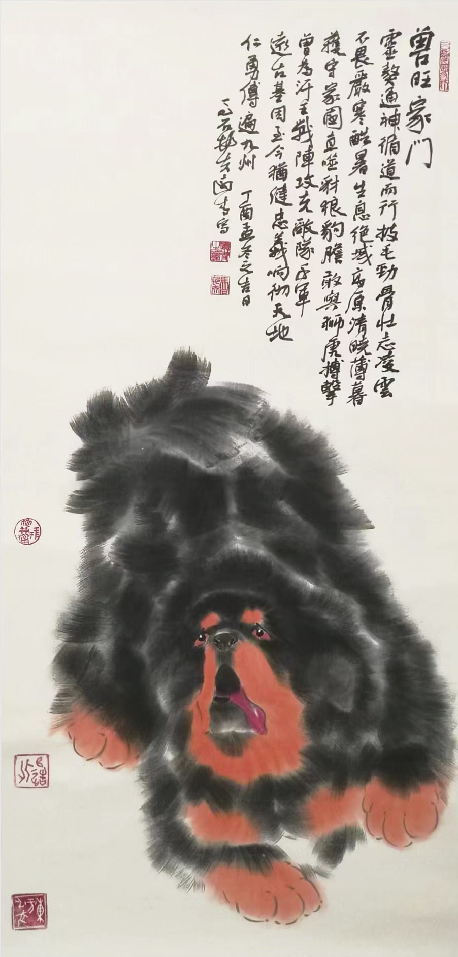 “神”的第二点就是远青画出了藏獒的孤独美,这也是这些藏獒的精神。我说的孤独并非孤单,而是高不可攀。这也是前面提到的霸悍的延续,因为内心的强大,因为志向的远大,让这些藏獒曲高和寡,它们也沉醉于这种高蹈中,犹如日月烛照天地,灿烂而壮丽。比如前面提到的两幅,还有《忠勇神兽》、《镇宅神兽》、《神兽雄风》等等,画家除了展现藏獒的勇之外,还有藏獒自信和孤傲。那种壮美与藏獒的孤单合起来不仅让我们有了仰望,更让我们有了一种怜美的感觉。这也是画家自己理想和情怀的展示,是画家个人命运和心灵感受的泄露和显现,这就让这些动物和水墨有了情感和温度,而走心的作品就更能震撼心灵。