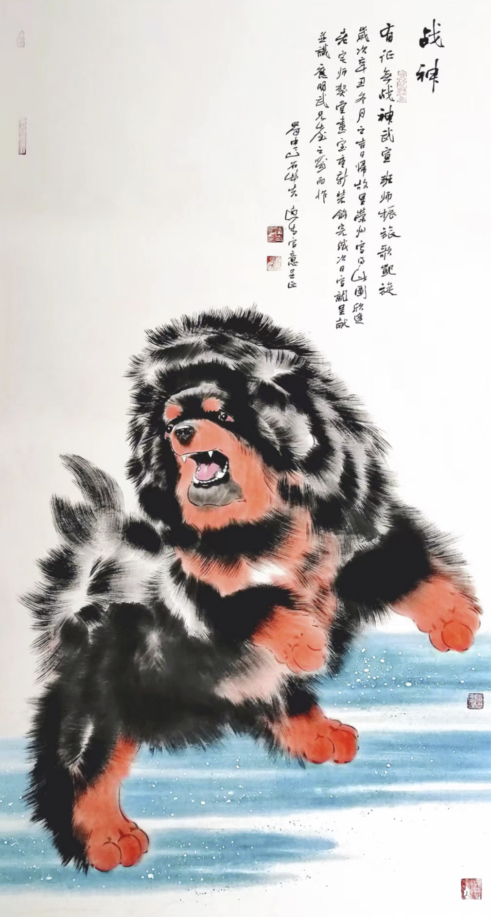 所以,远青绘画像从米粒里挑沙子,他是从心里往外捡杂质,都一样的细心、耐心、真心,直到米里没有一点杂质,心也没有一点尘埃。你看他这些纯如青瓷的藏獒,不论是卧伏如钟,还是昂立如松,抑或是如闪电一样奔赴,如飓风一样腾跃,其画面都是那么清澈和澄明,而藏獒的神情都是那么高傲和优雅,还有一种俯视甚至蔑视一切的霸气和强悍。这是一种弃绝凡尘的超然之态,也是一种永远向上的能量在喷薄,整体给人一种纯洁傲然之美,又热血沸腾心击长空的激越和豪迈。