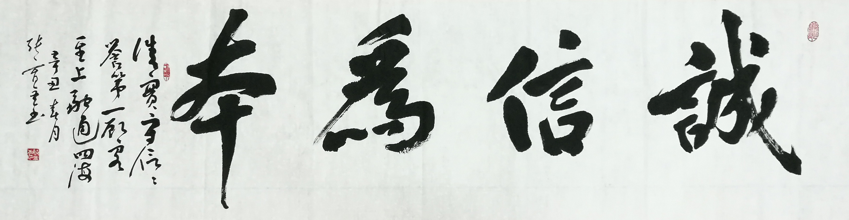 印象中的张育金先生,每每品味其作品,一种敬重之情便油然而生。先生眉清目秀,方耳大脸,言语稍少,可谓心定神闲讷于言而敏于行。自幼习书,初学欧阳询,后深学王羲之、颜真卿、苏轼、米芾、黄庭坚等诸家碑帖,初具格调;然学海无涯,书艺无境,后又追现代书风,涉猎沙孟海、启功等名家,书艺精进、已具特色,自成一家。中国书法是点线而组合的视觉艺术,点线的的灵动与韵律在张育金先生笔下如行云流水、或汹涌澎湃,或宁静致远。先生的作品颇有特色,其笔法自如,舒张有度,字形丰腴刚健似颜筋,遒劲如柳骨,方直如欧体,神情犹二王;其书法艺术笔墨轻重缓急、粗细交映,其笔墨变化有法可循,犹其结构得体,前乎后应,上钩下连。将静气宁宇悬腕、出笔似有太极之从容运筹耳。其代表作行草有滕王阁序、篆有醉翁亭记等名篇。可谓是书法爱好者及收藏家首选。