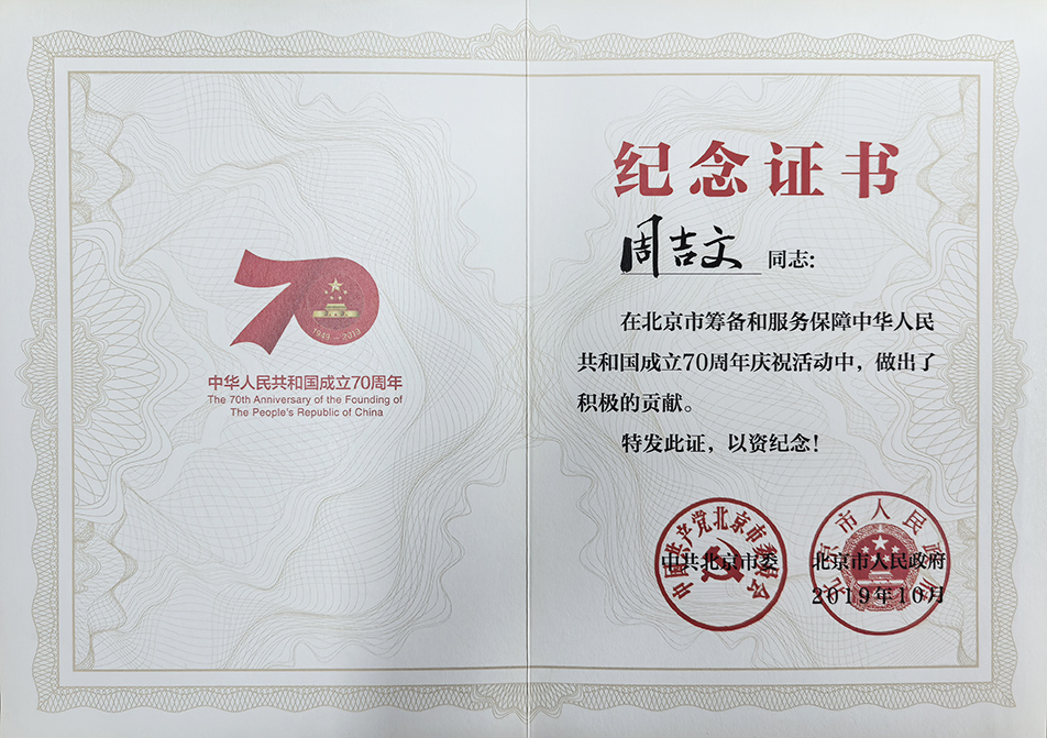 2019年,由中共北京市委、北京市人民政府共同颁发“保障中华人民共和国成立70周年庆祝活动积极贡献”表彰证书。