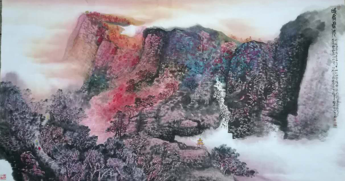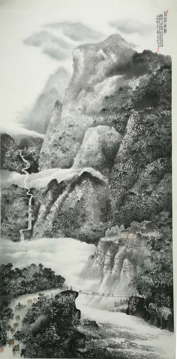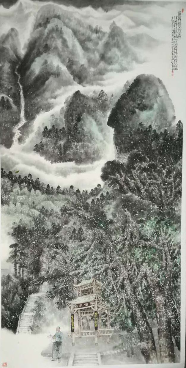 认识宋大中是在1991成都市老年大学教学期间,他是学校的管理人员,又是代山水画课、书法课班主任,认识久了才知道他也喜欢画,从小跟父亲学,临摹《芥子园画谱》,尔后,从临摹古画到近代张大千等名家的画。灿烂的中国古典文化艺术强烈地吸引着大中这个孜孜不倦的学子。在当班主任期间,他特别好学好问,从不怕麻烦,喜欢把自已的画拿给我点评,有的作品象么象样,有的经我点拨,也出新意。我常讲山水画艺术要“重基础练习,重用笔用墨”,还应“苦学勤耕,至诚治学”,“多去写生,不要走捷径,当速成派”,“画要专一,不可画多样”。他悟性很好,很快确定了专攻山水画。为了参加省、市美协展览,常到四川省教育学院我家里来请教,经指导后,能熬夜几天坚持完成,参加省、市美展。