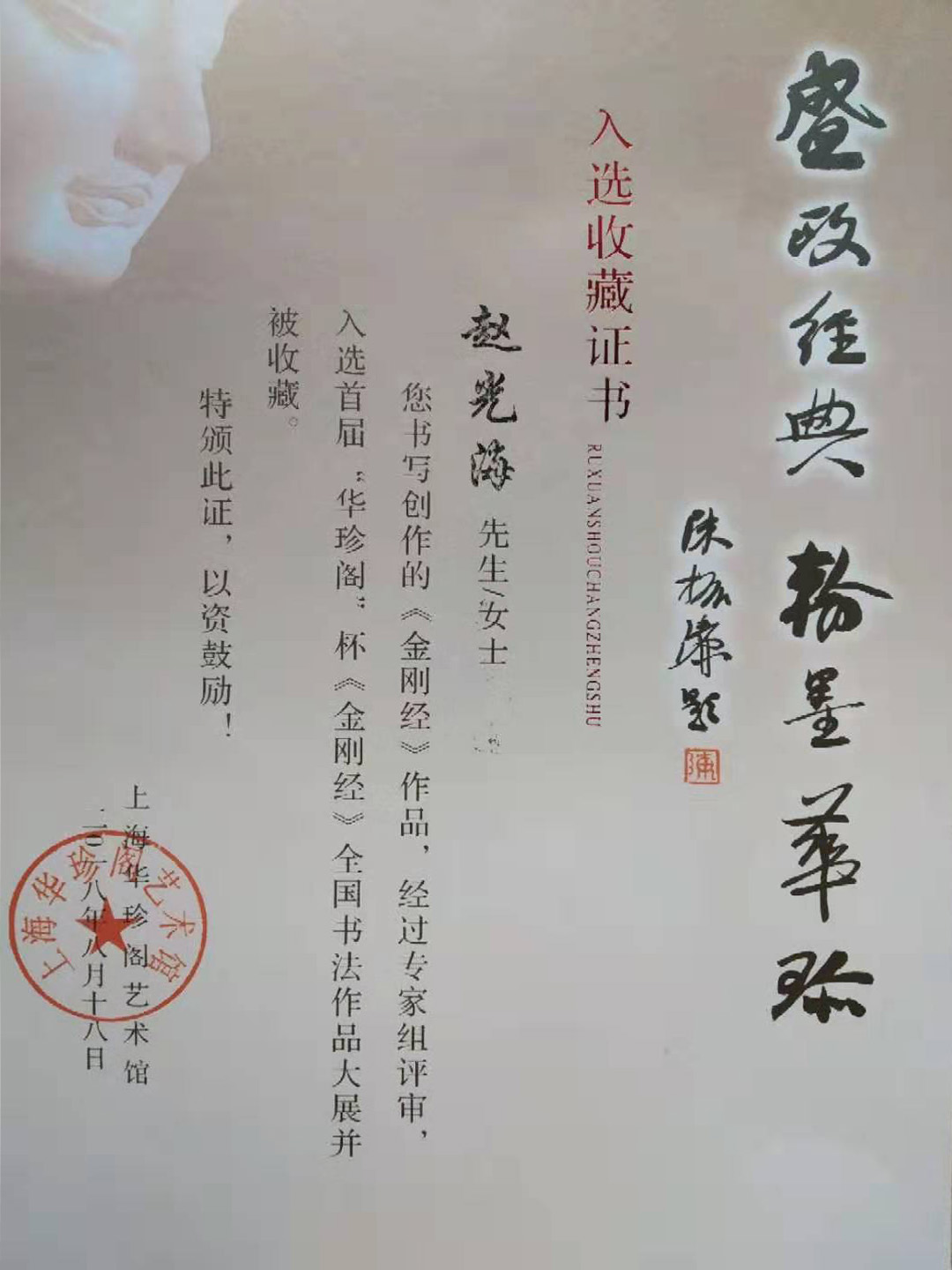 首届书法“印象杯”全国书法、硬笔书法大赛三等奖,首届华珍阁杯“金刚经”全国书法作品大展入展,敦煌写经院一经一卷写经书法大赛优秀奖。