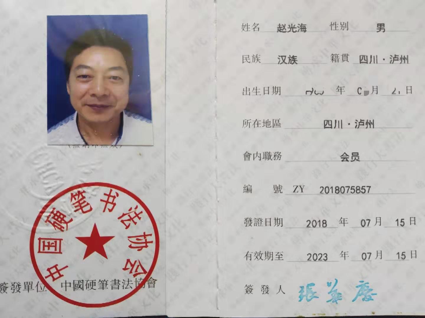 赵光海,中国硬笔书法家协会会员,文化部注册书法家(高级)。