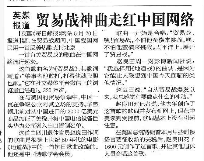 赵良田(1965.8--),四川盐亭县人,当代著名爱国诗人、词作家,儿童文学和财经作家,中国诗歌学会会员。出版有诗集《欢乐与忧伤》《诗眼看世界》和《爸爸的铁盒子》《地球保卫战》《红烛长明》等小说、电影剧本、人物传记作品多部,部分作品被翻译成英语、俄语、泰语和乌尔都语和希伯来文介绍到国外。其创作的诗歌通俗易懂接地气,受到普通读者欢迎。其中《贸易战》《三大纪律八项注意》(防疫战歌)《崔永元之歌》《诫子书》《当我还能发出光和热的时候》等作品或被著名朗诵家朗诵或被谱成歌曲广为传唱,在民间影响很大。先后获得各种文化艺术创作奖励二十余次,2018年4月14日,被诗文艺联合会、诗文艺诗歌奖组委会评为“中国杰出诗人”。