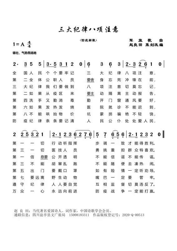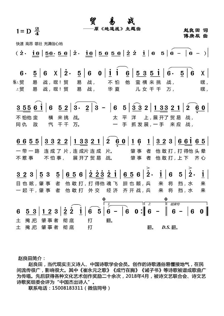 赵良田,当代著名爱国诗人,词作家,一级作家。中国诗歌学会会员,"写广大人民群众喜欢的作品,做对人民有益的事情”,这是赵良田老师坚守的创作原则。赵良田创作注重时代旋律与人民精神需求的表达,内心始终被浓烈的爱国爱民激情所充满,因此作品通俗易懂,诗意盎然,即成为其主要艺术特点。代表作《贸易战》《崔永元之歌》《诫 子书》《当我还能发出和热的时候》和防疫战新歌《三大纪律八项注意》等作 品或被朗诵家或被谱成歌曲广为传唱,影响巨大。赵良田先生以写诗歌闻名四海,堪称当代诗歌奇人。作品笔法讲究,构思巧妙,简洁明快而富有诗意,深受群众喜爱,每篇作品都是作者用心血和汗水浇灌出的艺术成果,每篇作品每句话都闪耀 着艺术光芒,奏响了时代最强音。