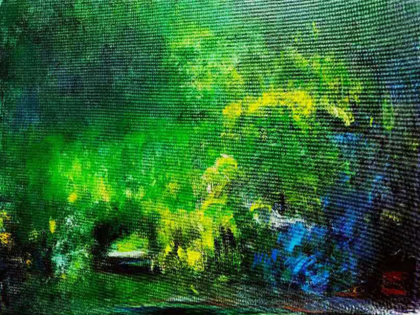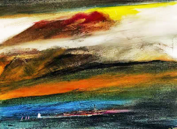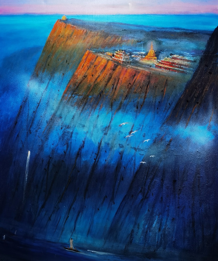 在他有意象的油画里,常常可以读到中国山水的气韵生动。斑斓的色彩交融,再加上光影的焕神,让他的油画泊进了山水画随类赋彩如诗曼妙的气韵美感。所以他的油画作品,并不是生硬地复制自然,而是要把自然物象经过心化酝酿,再铺陈于画里的主观情景!印象与意象在画里融合得天衣无缝,主观与客观相得益彰。一幅东方古堡,足可以看得到意象油画的唯妙!