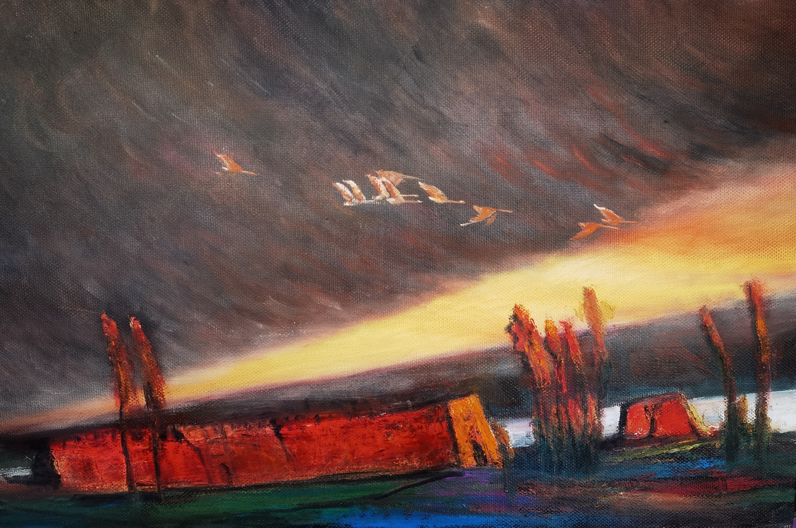 如果丁潮先生的油画,只有西式的法度表现,那么也不能建树起独树一帜的艺术造诣。他在通谙西式画法的前提下,又有主动把东方审美的意象融进油画的探索成绩。这个探索方向,与徐悲鸿的功绩有相同的文化融合价值,但是实现文化融合价值的方向是有区别的。徐悲鸿是在用油画的方式去影响中国画,丁潮是用中国画的方式去影响油画创作。丁潮对东方审美的“意象”概念很熟念,所以让油画里出现意象气韵就显得很自然。