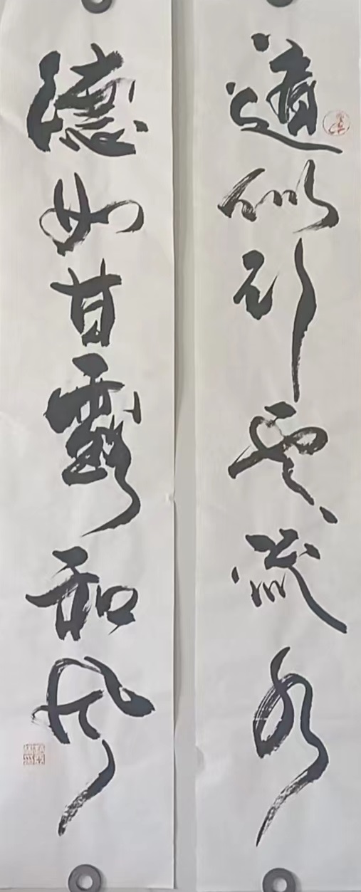 他的书法以行,草,隶,篆,碑融为一体,他的作品中蕴含了绘画,诗歌和舞蹈的元素,形成了自成一家的险、绝书风