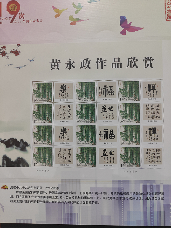 近年来,中国大众文化学会、中国邮政连续三次选用作品,为庆祝中国共产党十九次代表大会召开,庆祝改革开放四十周年,庆祝中华人民共和国成立七十周年出版书法艺术珍藏邮册。