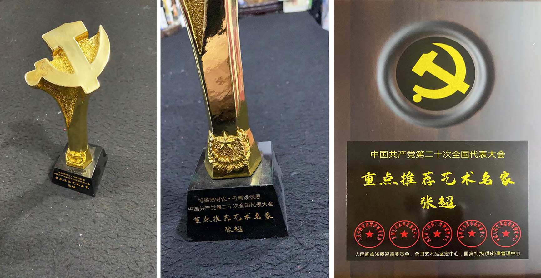 2017年受邀参加第20届北京艺术博览会,参加组织创作千米长卷(2583米),获世界吉尼斯记录,同时创作《蓝色之梦》十九朵蓝牡丹,在全国政协收藏馆展出并收藏,2017年10月1日中法建交53周年珍藏邮册,作为法国国家名片,在全法国及全球发行。书画颂盛世、艺术铸丰碑—2018年全国两会重点推荐艺术家,2019年中华人民共和国成立七十周年出版纪念珍藏邮票,全国发行。(2020年由美术档案出版社出版的收藏年鉴)(润格价每平尺16万),,2021年入编中国美术档案出版社出版的水晶琉璃画册《中国艺坛榜样人物–张超》为各国大使馆收藏,2021年入编中国文献出版社出版的《百年巨匠》,2021年作品入编《意大利教科书》,2021年在北京参加御宝嘉和国际拍卖有限公司举办的画美北京、画美山东、当代翰墨名家邀请展、全国巡展!2021年秋、北京御宝嘉和国际拍卖公司、中国书画专场、雅昌艺术品拍卖官网、《兰色之梦》成交价9、89、000元人民币、《一览众山小》成交价为2、990、000元人民币。建党一百周年制作的国礼套装瓷杯茶具作品《一览众山小》一套为中南海专用。2021在江苏宜兴建成张超美术馆。2022年冬奥会出版瓷板画:《蓝色之梦》为冬奥会艺术大师。20大重点推荐艺术家,出版20大纪念珍藏邮票,亚洲卫视专题报导,搜狐视频官网,世界艺术人物—张超。2022年智港全息—冷军、张超美术馆。华尔街日报,洛杉矶日报,英国日报,美国新科技,阿联酋新闻,美国时代周刊,纽约每日新闻,等世界各大网络同时报导。世界多个国家的媒体做了专题报道,2022获得国际官方认证资质证书,作品通过中、英、法、德、意相关国家文艺部门的评审,人民币润格850000元/平方尺,美元润格120000美元/平方英尺,欧元润格120000欧元/平方英尺。中国共产党二十次代表大会,重点推荐艺术家。2022年出版:《时代风范》、《典藏》、《中华非遗传承人物年鉴》。在2022年北京传世水墨国际拍卖有限公司举办的翰墨千秋2022年秋季艺术品拍卖会上作品《万紫千红》以人民币26、800、000元落槌成交。2023年被授予“金砖艺术家”荣誉称号。