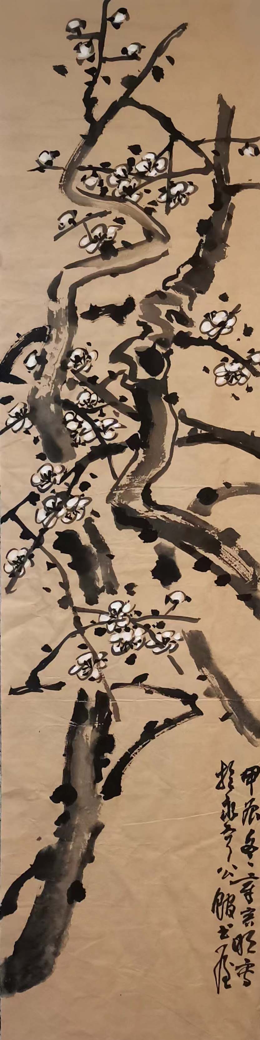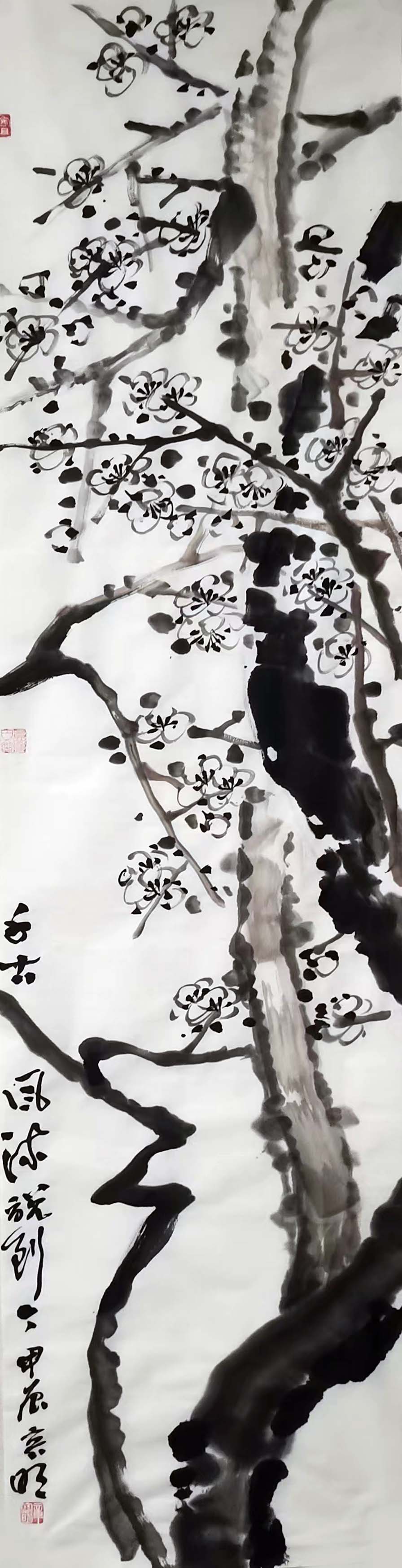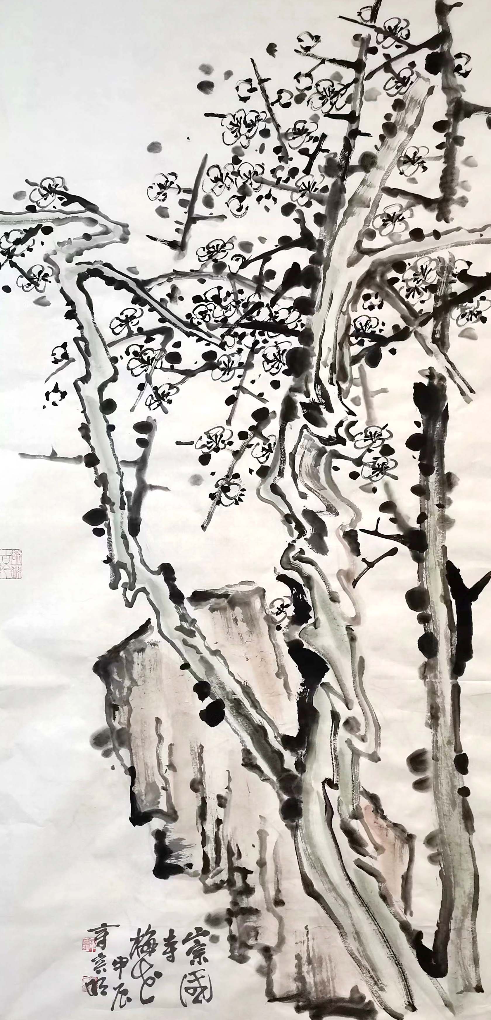 章容明先生受父亲影响,醉心为古梅写生,挥毫落纸如云烟,潇洒自如,画面神旺气足,痛快淋漓。父子写梅,各尽其妙,圈内有“章梅”之誉。章容明有语,古人窘迫于书画家之称呼,书画乃读书余事,文以载道,以文养浩然之气,下笔才有情绪。四分读书、三分写字、三分画画才好,否则易滑入书匠、画匠之俗态,故自制印一枚“略通世事之变”。章先生独子章楷为中国美院环艺系副教授,章先生祖父章宇斋为诸乐三同窗好友,一家四代游于艺,丹青传家,书香门第。